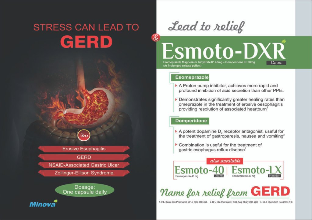 Gastroesophageal reflux disease (GERD), heartburn, acidity, and gastric ulcers are growing concerns in modern lifestyles. Esmoto-DXR Capsules, a unique combination of Esomeprazole Magnesium Trihydrate IP 40mg and Domperidone IP 30mg, offer rapid and sustained relief from these gastrointestinal issues. Brought to you by Minova Life Sciences, Esmoto-DXR ensures advanced acid suppression and prokinetic action in one dose.