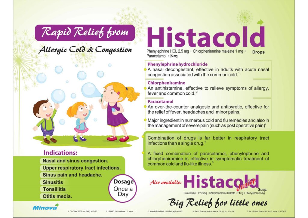 Children are highly vulnerable to colds, congestion, sinus infections, and flu-like symptoms due to changing weather, school exposure, or seasonal allergies. Histacold Drops and Histacold Junior Suspension by Minova provide a fast, safe, and effective solution for pediatric patients. This combination of Paracetamol, Phenylephrine, and Chlorpheniramine targets multiple symptoms of upper respiratory infections, delivering relief in a single once-daily dose.