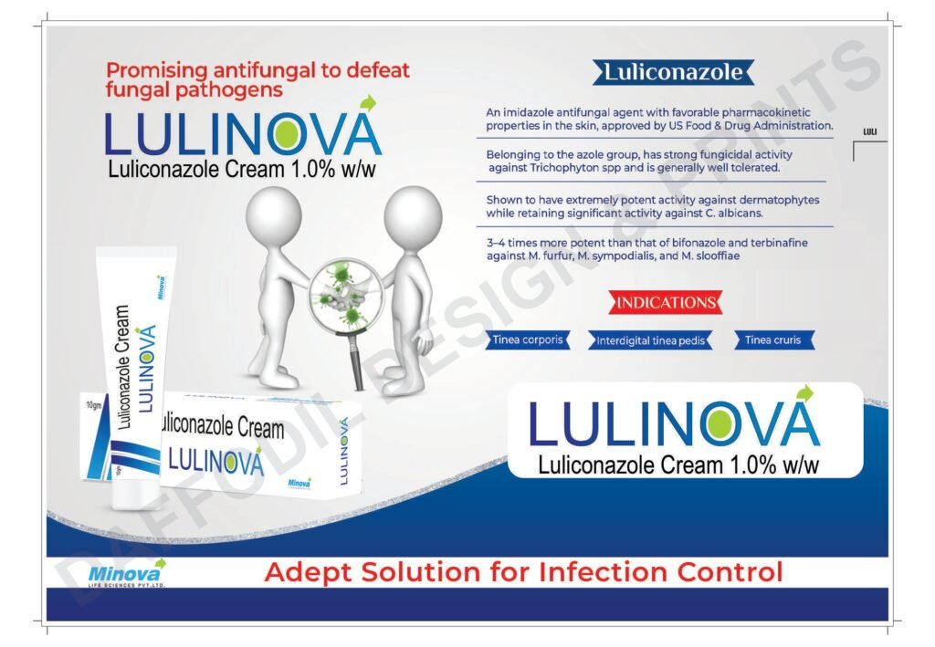 Lulinova Cream is a powerful antifungal formulation containing Luliconazole 1.0% w/v, which is highly effective against a wide range of fungal infections, including ringworm, athlete’s foot, and jock itch. It works by inhibiting fungal growth, ensuring rapid relief from itching, redness, and discomfort.