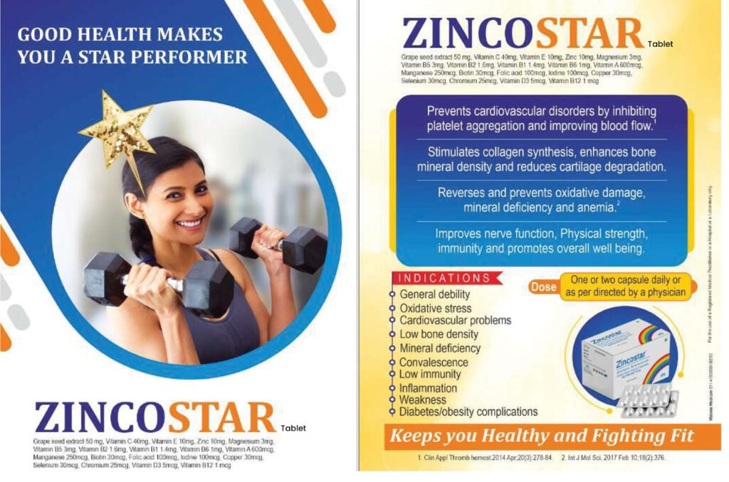 Zincostar Tablet is a scientifically formulated nutritional supplement enriched with Grape Seed Extract, Vitamins (C, E, B-complex, D3, B12), Zinc, Magnesium, and a blend of powerful antioxidants and trace elements like Copper, Selenium, Chromium, and Manganese.